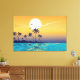Tropical sunset, palm trees, ocean wrapped canvas print, featuring an idyllic tropical scenery landscape of the setting sun, palm trees, birds the sea with reflections and birds. The sky is in red orange tones and the horizon in purple grey.