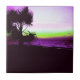 A digitally enhanced tropical sunset. A beach with palm trees in purple