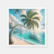A curved palm tree with a swing hanging from it is situated on a sandy ocean beach
