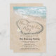 Tropical beach themed new years eve party invitation featuring the blue ocean shoreline, a heart carved in the sand, and a new year celebration template that is easy to personalise.