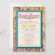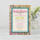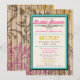Tropical coloured Bridal Shower Invitations with flourishes swirled in a tattoo watermark style over a wood texture, and custom printed with your personalised Shower details. Designed in fuchsia pink, turquoise/teal, and deep yellow.