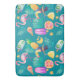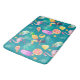 There's a fun splash of colour on this cute bath mat featuring a pattern of images including a toucan bird, a pink flamingo, an ice cream cone, ice cream bars, a bright grapefruit slice, and a lemon, all surrounded by gold stars and green palm leaves. The multi coloured, bright images are placed on a teal background. Be sure to see the matching shower curtain in our store.