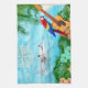 Digital artwork of a tropical beach with a macaw parrot perched on a guitar and a Albatross seaplane in the bay.