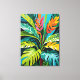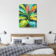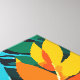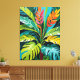 This design captures the lush beauty of tropical foliage in a bold, stylised manner. The composition features a striking arrangement of diverse plant leaves, including broad monstera leaves, slender palm fronds, and vivid heliconia. The colour palette is rich and eye-catching, with shades of green ranging from lime to emerald, accented by bright oranges, yellows, and pinks.