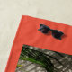 Feel the Tropical Vibes with this Colourful orange beach towel with a Hibiscus blossom, straw sun hat and shadows of palm fronds cast on the sand.  This image is original beach photography by JLW_PHOTOGRAPHY.
