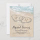 Beach destination wedding bridal shower invitations featuring a summer tropical beach island background, a vintage sandy beach with two hearts in the shoreline, your initials and a wedding text template.