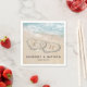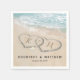 Beach destination wedding napkins featuring a summer tropical beach island background, a vintage sandy beach with two hearts in the shoreline, your initials and a simple text template.