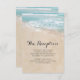 Beach destination wedding reception information cards featuring a summer tropical beach island background, a vintage sandy beach with two hearts in the shoreline, your initials and a wedding text template.