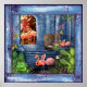 Blue marble pillars, archways to an indoor fantasy palace, with steps leading into a water pond, greenery ,plants, pink flowers, flamingos and an old fashioned cane reading chair.