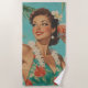 A glamourous woman in a floral dress and Hawaiian lei enjoys a cocktail under palm trees, radiating retro island charm and vacation bliss.