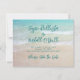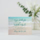 Save the date wedding announcements with modern font over a tropical seas background. Smaller size cards (4x5) have a turquoise blue water scene and beach sand behind dark blue-green text templates. Full names of the couple are at the top in handwritten script. Customise three printed lines in the centre with location, wedding date and website or “formal invitation to follow”. The “save the date” text is along the bottom. The back of the card also has a beach scene. You may change the card size, but the design will not fit all sizes. It will print as it appears!