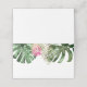 Modern tropical theme place card featuring watercolor illustration of monstera leaves, palm leaf, and pink king protea flower. Perfect for your summer wedding, bridal shower, baby shower, or birthday parties.