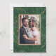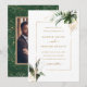 This wedding photo invitation card features watercolor green tropical foliage, monstera leaves, palm tree leaves, banana leaves, and faux gold leaves accents with a tropical pattern on the back. It's perfect for a beach or destination wedding.