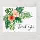 Modern yet elegant Thank You wedding postcard design featuring watercolor tropical leaves and hibiscus flowers on a white background.