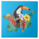 Tropical, delicate watercolor toucan in pink and orange hibiscus flowers with tropical foliage.