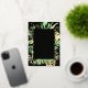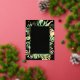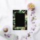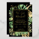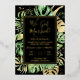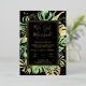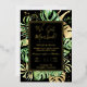 This elegant tropical elopement reception invitation features green and gold palm, philodendron, and fern leaves on a black background. An elegant gold foil frame highlights the gold foil text. Gold foil splatters accentuate this exotic botanical design and brings a bit of modern whimsy to the invitation. "We Got Married! " along with the bride and groom's names are featured at the top. Wedding vow details and reception location and date are detailed underneath. RSVP information is on the back of the invitation.