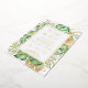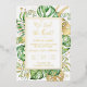 This elegant tropical elopement reception invitation features green and gold palm, philodendron, and fern leaves. An elegant gold foil frame highlights the gold foil text. Gold splatters accentuate this exotic botanical design and brings a bit of modern whimsy to the invitation. "We Tied the Knot! " along with the bride and groom's names are featured at the top. Wedding vow details and reception location and date are detailed underneath. RSVP information is on the back of the invitation.