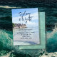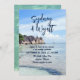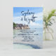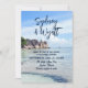 Tropical wedding destination invitations. Crystal clear sea water and a rocky coastline is the image behind your choice of text. Names of the couple are at the top in large script. The date and time of wedding is printed to stand out from the remainder of the invitation text. This sunny scene is meant for a small private gathering or a casual celebration.