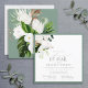 Modern, elegant square bridal shower by mail invitation featuring a bouquet of white orchids and proteas, and tropical botanical greenery, bordered in pale eucalyptus green. Personalise your bridal shower details in soft off-black, accented with beautiful modern hand lettered calligraphy. The back of the card features a matching lush tropical bouquet over a matching pale green texture. Copyright Elegant Invites, all rights reserved.