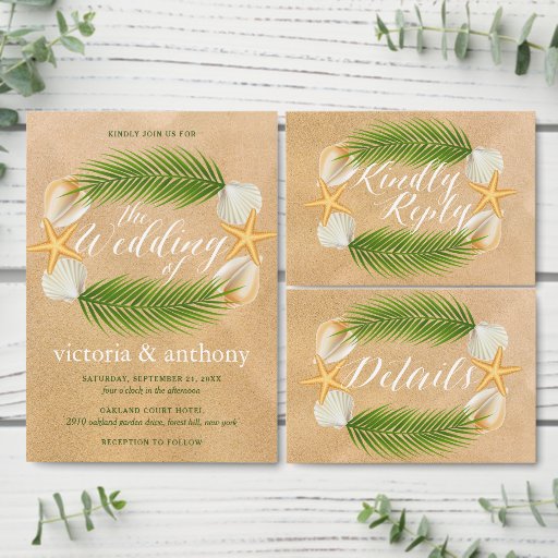 The design features a tropical wreath of palm leaves, seashells & starfish on a sandy background with color coordinated wording.