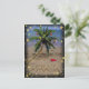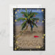 Palm-tree, decorated with christmas ornaments on a sandy beach. Words "Happy Xmas" written in the sand.