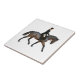 This tile features a digital rendering of a dressage horse and rider, seen from the side. The rider is wearing a black top hat, boot and a black riding jacket. Horse lovers and dressage enthusiasts will enjoy this tile.