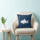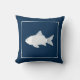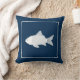 Decorative throw pillow with white fish on navy blue background. See all the coordinating pillow designs at Sandy Feet Studios.