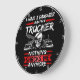 This bold wall clock speaks to the resilient nature of a truck driver who is also a parent. Against a black background with a white rim, it features a skull flanked by two semi-trucks. The text declares, "I HAVE A DAUGHTER AND I'M A TRUCKER NOTHING SHOCKS ME ANYMORE," highlighting the perspective gained from these demanding roles. The design tool can also be used to add custom text.