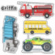 Sheet of scrapbook stickers for boys or girls with trucks and bus shapes. A fire truck, school bus, monster truck and garbage truck are featured on this sheet, which comes in many sizes. Include the boy's / child's name if you wish, or delete the sample text. Great for girls who love big vehicles too! Use for journalling and scrapbooking or add to special treats for the child.
