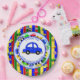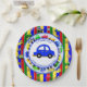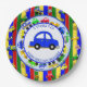 Personalised Blue, green, yellow, red cars, tractors, trucks and traffic sign boy's birthday party paper plates.