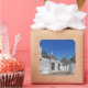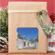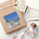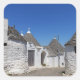 Photo sticker with traditional white plaster trulli houses with stone tiles in conical roofs in a small street in the town Alberobello, Itria Valley in Puglia, Italy.
