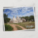 Postcard of the white stone, cone shaped traditional trulli houses with a driveway and a garden with olive trees under a nice sky on a vacation resort near Alberolbello in Puglia/Apulia in southern Italy with a white edge and in sky blue the text 'Puglia'. The photo is a bit rotated to create the illusion of it laying loose.