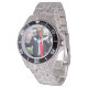 Has heft and feel of expensive stainless steel quartz watches. Good band with safety catch. I removed links, which is easy because engraved arrows show direction to push the linking pins. As always by this seller, the image (a railroad logo) is a perfect reproduction of my emailed image, and is precisely spaced and aligned.