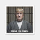Trump locked up behind bars with Trump For Prison typography wearing his grey prison uniform