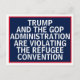 Image description: Midnight blue rectangular box with a bright red border on a white background. White all caps sans serif text reads over 6 lines, "Trump and the GOP Administration are violating the Refugee Convention."