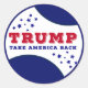 Support President Donald Trump in Taking America Back in the 2024 United States Presidential Election with this one of a kind round sticker featuring red, white and blue patriotic Trump design and blue and white shooting stars.