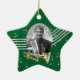 Trumpet star holiday photo ornament in green with silver music notes and photo ornament for your favourite musician. Personalise text on back as preferred.
