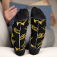 Cool black socks patterned with trumpets and stars. Colourful musical instrument socks, perfect for brass band, marching band, and jazz lovers.