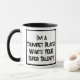 Funny slogan on a Two Tone Coffee mug that says "I'm a Trumpet Player. What's YOUR super talent?". Two Tone Coffee Mug for a Trumpet Player. Black and white bold text.