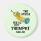 The world needs more trumpet solos in rough text with the image of the earth in the bell of the trumpet is a funny gift design for brass musicians, music teachers and students in concert, jazz and marching band.