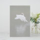 A photograph of a white swan stretching out it's wings whilst wading in a shallow river.