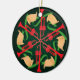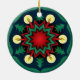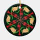 This dramatic ornament features a beautifully crafted design of trumpets and ribbons. Musicians and non-musicians alike will enjoy the bold red trumpets, parchment and ribbons against the dark green circle. On the back is a design of a bright star, Christmas trees and candles.