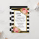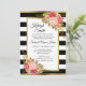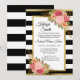 Trunk party invitation with a black and white horizontal striped pattern and pink and glittery gold flowers with a shiny gold trim.
