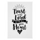 Distressed, Modern Brush Script Design typography emblem with words Proverbs 3:5, "Trust in the Lord with all your heart" in black letters on white background with hand-drawn heart accent and light rays.