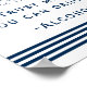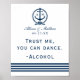 Custom nautical themed "Trust me, you can dance. -Alcohol" poster / sign to be displayed at the wedding reception. Navy blue custom text and white background colour. Customise the boat anchor with knotted rope monogram design with the bride and groom initials, names, and wedding date. Horizontal stripes accent the design.