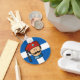 Head of Greek Evzone (tsolias) cartoon, wearing red fez. Old Greek flag background. Custom text back.