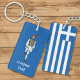 Greek Evzone guard (tsolias) icon holding a gun, wearing red fez, fustanella and tsarouchia. Custom background colour. Custom text. Flag of Greece at back side.