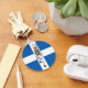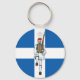 Greek Evzone guard (tsolias) icon holding a gun, wearing red fez, fustanella and tsarouchia. Old Greek flag background. Custom text back.