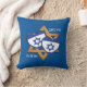 Stylish TU B'AV Valentine Jewish Day of Love Throw Pillow in TEKHELET BLUE with CUSTOMIZABLE TEXT for men and women who are celebrating the Jewish Valentine holiday of Tu B'Av, also known as the Jewish Day of Love. The design shows the Star of David flag of Israel in the shape of two hearts, with a larger Star of David in the background. The Hebrew text (top) is translated 15th of Av. All text is CUSTOMIZABLE so you can replace with names or other text (or delete).