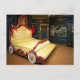 Tufted sleigh bed with wheels and a peacock postcard